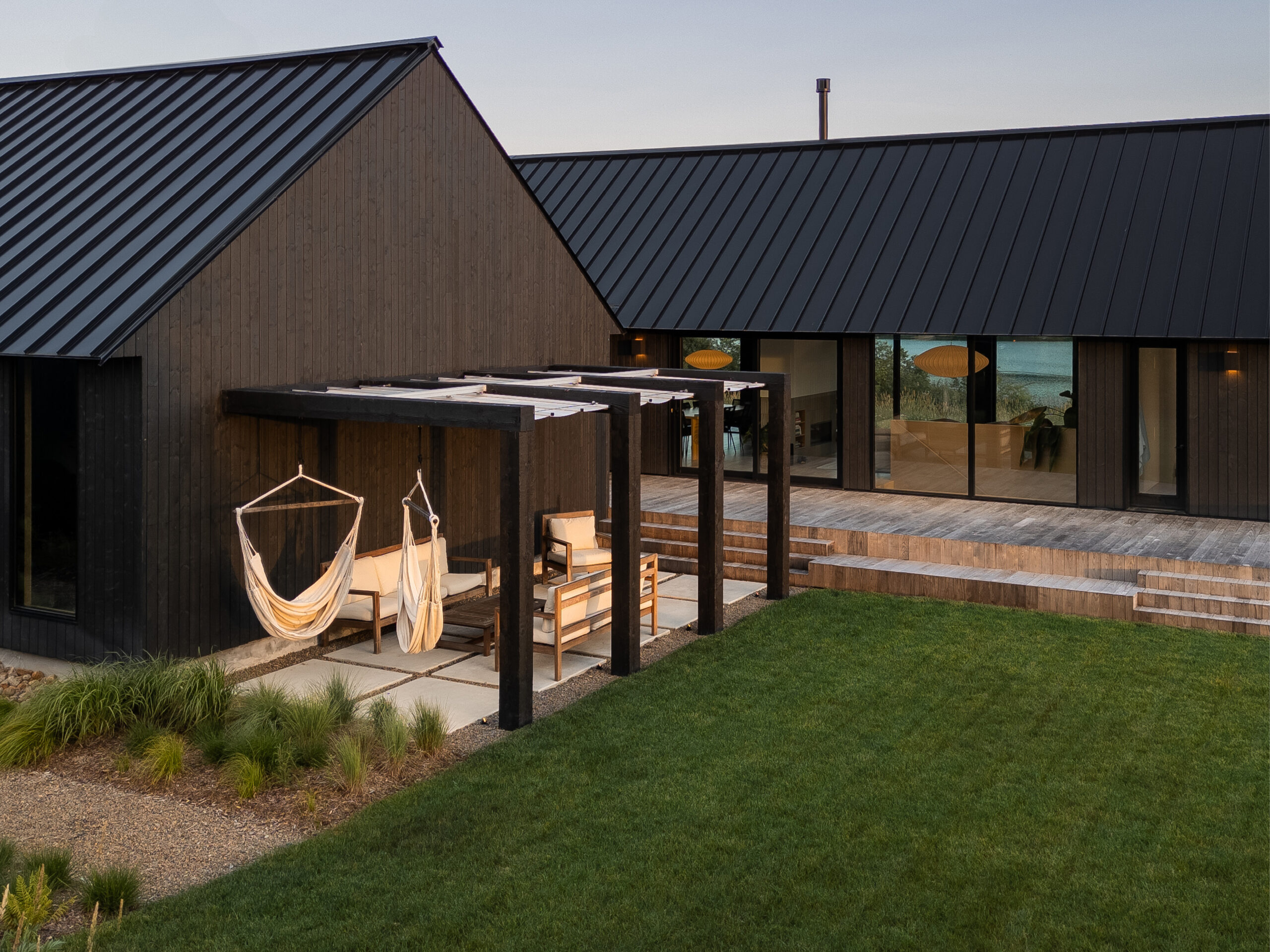 Amidst a rolling meadow landscape, the clients sought a design that would anchor their modern barn-style home within its natural surroundings while providing practical and welcoming outdoor spaces. The landscape opens with a wide granite walkway that creates a clean, direct approach to the main entrance. A generous deck extends from the home and incorporates both a spa and comfortable seating areas, creating functional zones for relaxation and year-round use. Gabion walls are used strategically across the property to define edges, manage grade transitions, and introduce a rugged texture. These elements are softened by broad sweeps of meadow grasses, which integrate the built spaces into the surrounding environment. The result is a landscape that feels cohesive, restrained, and well-suited to its rural setting, providing a clear and comfortable framework around the home.